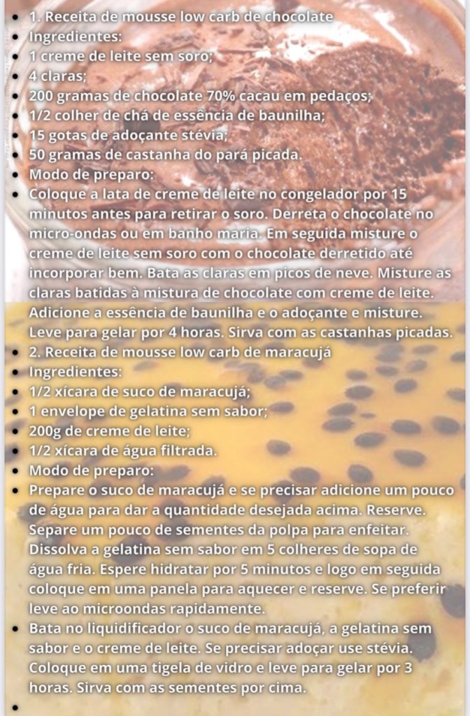 105 receitas de Doces para comer sem culpa, as melhores receitas e mais fáceis de fazer! •15 Receitas de Bolos Low Carb •10 Receitas de Brigadeiros Low Carb •10 Receitas de Brownies Low Carb •10 Receitas de Chocolates quentes Low Carb •10 Receitas de Cookies Low Carb •10 Receitas de Ovo de Colher Low Carb •10 Receitas de Geladinhos Low Carb •10 Receitas de Donuts Low Carb •10 Receitas de Mousse Low Carb •10 Receitas de Trufas Low Carb